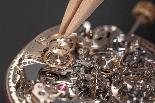 What ultimately defines the L.U.C Grand Strike is its sound. The watch employs Chopard’s proprietary sapphire crystal gongs, machined as a single monobloc with the dial itself. Unlike traditional steel gongs, which transmit vibrations through the movement and case before reaching the ear, sapphire gongs channel sound directly outward. The result is a chime of exceptional clarity and projection. The square cross-section of the gongs further produces a layered, harmonically rich resonance. Sapphire’s extreme hardness ensures that this acoustic signature remains stable over time, immune to deformation or fatigue. The chime itself is tuned to a C-sharp and F natural interval, chosen for its sense of balance and unity. It is a detail that reflects Chopard’s sensitivity to the emotional dimension of sound.