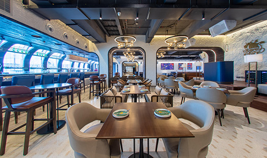 When you first enter Flow, you are greeted by a long gallery, with a microbrewery on your right and tinted mirror glasses on your left. The outlet itself is huge—5500 square feet of indoor space and a stunning outdoor dining area of 3500 square feet that overlooks the city. The tastefully designed interiors, which fit the bill for all-day dining as well as evening events, are reflective of the restaurant’s muse, a shapeshifting octopus that adapts according to its environment.