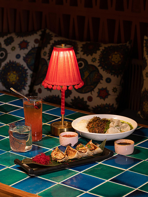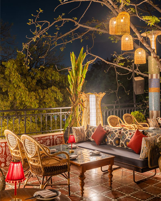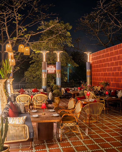 A modern-day fort, with mosaic murals and tiled walls, it is a rooftop bar that glows under the moonlight. Just like the moon goddess it is named after. The space is a vibrant mix of colour and calm, with the soothing sound of water trickling from terracotta fountains. With gentle breeze flowing through, swaying not just you but also the pendant lights that cast soft shadows, like secrets waiting to be told.