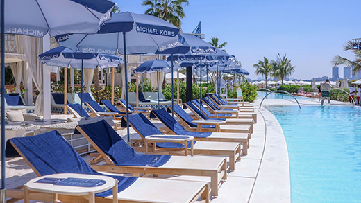 Michael Kors transported a bit of Tribeca to Jumeirah's The 305 in late February 2024—and the takeover has set the standard for beach club branding. Every inch of The 305 has been "Korsified": from deep blue cushioned cabanas carrying metallic MK emblems.