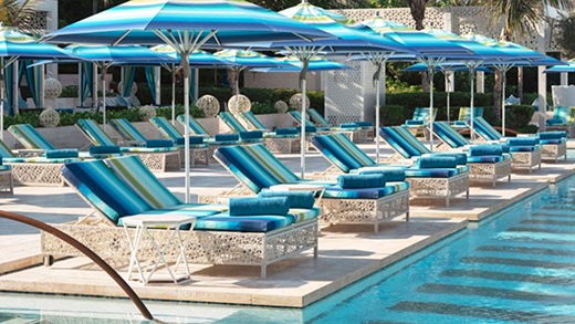 Styled Surroundings: Custom Cabana prints feature Ferragamo's iconic Gancini clasp, while bespoke sun lounger cushions and parasols bring runway-ready colors to the beach.