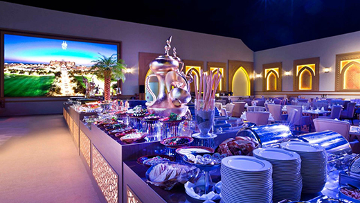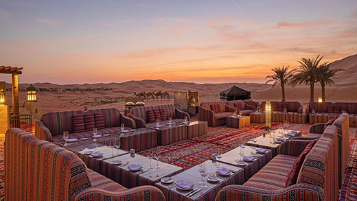 Al Falaj at Qasr Al Sarab offers a Bedouin-inspired Iftar that’s pure magic. The sharing-style menu is full of Levantine flavors—grilled meats, fragrant rice, and warm bread—all enjoyed under a starry sky. Live oud music fills the air with soulful notes, and on March 7 and 8, chef Maroun Chedid’s exclusive set menu elevates the experience even further. It’s a peaceful retreat that connects you to the desert’s timeless spirit.