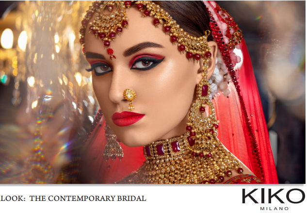 5. Contemporary Bridal - This theme emphasizes on the luminous face. Soft Smokey eyes with a wing liner captured by close shot of the lens is enthralling, magnetically pulling all eyeballs in admiration. The aim is to create a soft reflection of light and shade on the face with makeup which enhances the close-up of the look, making the bridal look traditionally trendy. It is created using full coverage foundation, bronzers, highlighters, along with other related products for the eyes and lips - all from KIKO MILANO.