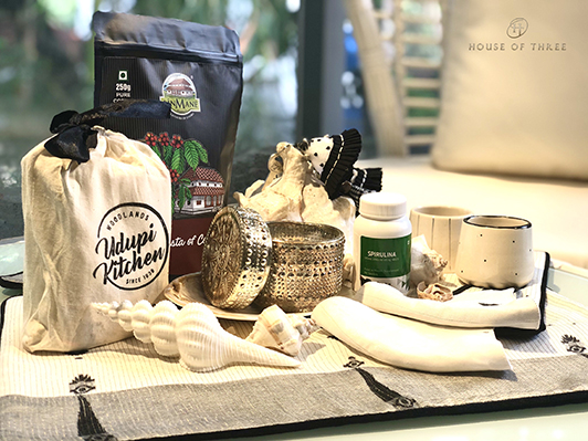 While quarantine life has many of us households, we can still find a bit of an escape with assorted luxury wellness gift boxes by House of Three. The box includes Jamdani place mats, espresso cups along with assorted Podi's from Udupi Kitchen, Coffee from Ainmane, Jamdani Mask, spirulina by Blue life, Glass Jar by Chairs & Company and Natural Kadha powder by Manak Mew. Price: from INR 5200 Available at: https://www.houseofthreestudio.com/collections/festive-well-being-gift-set