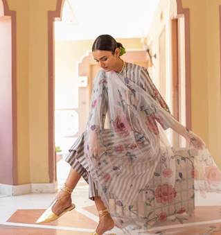 This striped silk handmade dress with block printed with hand embroidery and the fabric is yarn dyed stripes with block printed rose motifs and hand embroidery detailing. The dupatta is hand woven organza with block printed floral motifs and cut work embroidered trim. Price: INR 1180-28500 Available at: www.ogaan.in
