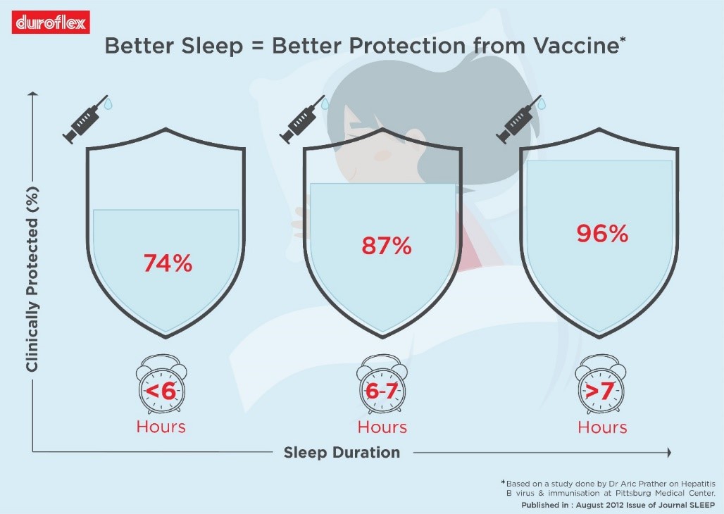 In our exclusive outreach to Dr. Aric Prather , Sleep Scientist and Associate Professor of Psychiatry and Behavioural Sciences, University of California, San Francisco who did the ground breaking study on the corelation between sleep duration and flu causing rhinoviruses, says, “Sleep is strongly tied to how well our immune system functions, especially when it comes to vaccines. Several studies show that a lack of sleep on the days surrounding vaccination is associated with a less robust antibody response.”
