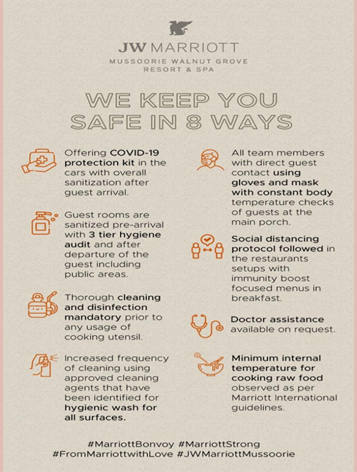Abiding on one common objective “Safety for our Guests”, JW Marriott Mussoorie is now under one of the many conscious chains to assure maximum safety for their guests and hotel associates under a new program - “Commitment to Clean”.