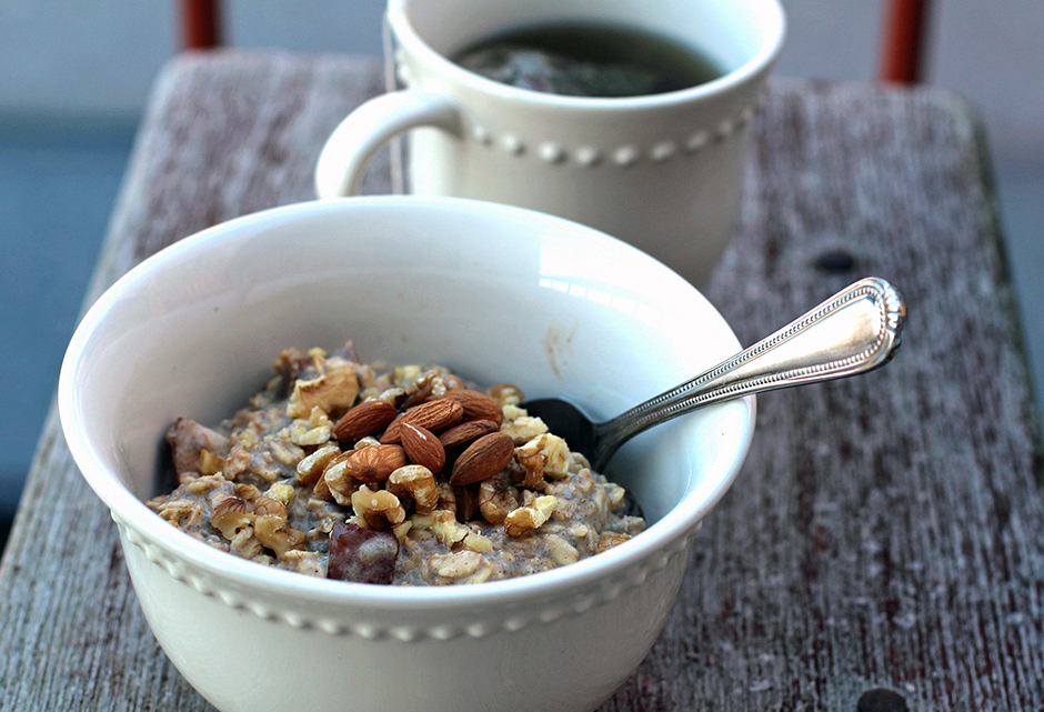 Ingredients: ½ cup rolled oats, ½ cup boxed coconut milk, ¼ tsp cinnamon, Pinch kosher salt, ½ cup chopped pear, 2 Tbsp granola