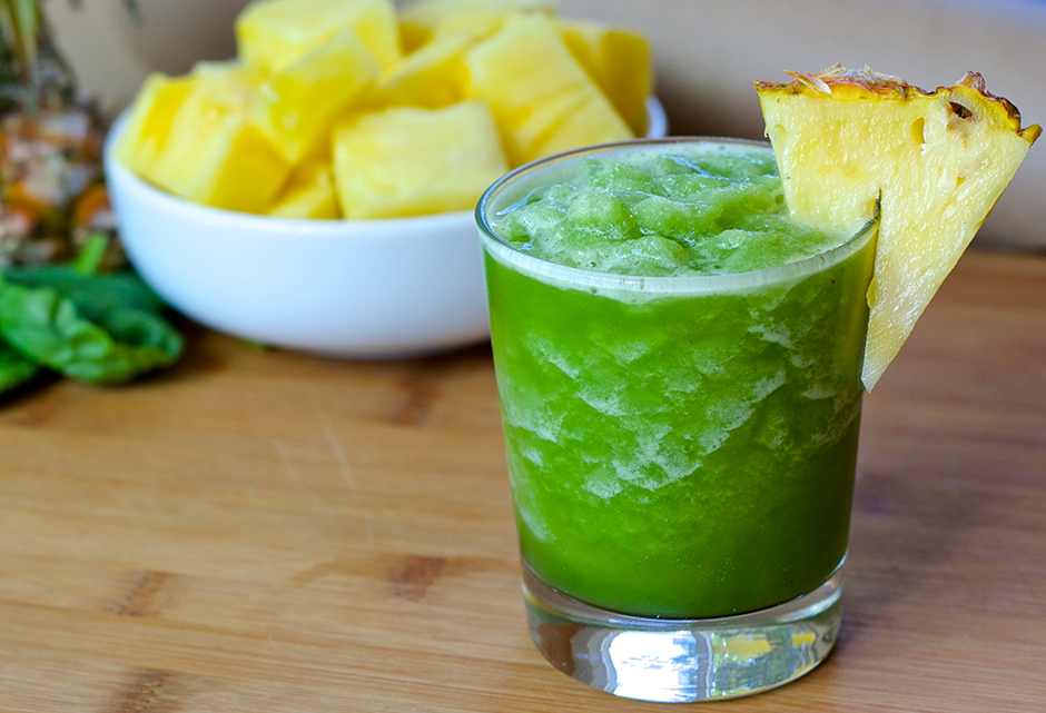 Ingredients: 1/2 cup orange juice, 1/2 cup Greek yogurt, 1 cup baby spinach, 1/4 large pineapple, chopped (or 1 cup frozen cubes), 1 tsp chia seeds