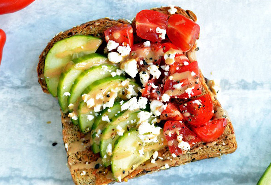 Ingredients: 1 slice of whole grain bread (I like Dave’s Killer Bread 21, Whole Grains & Seeds Thin-Sliced), 6 cherry tomatoes, sliced in half, 4-5 cucumber slices, about 1 inch thick, 1 Tbsp tahini, 1 Tbsp feta cheese.Salt and pepper to taste.