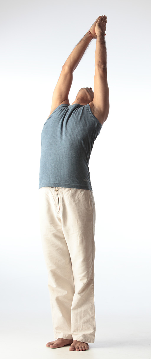 1.) Inhale, stretch your hands in front of you, keeping the palms together and raise your arms up