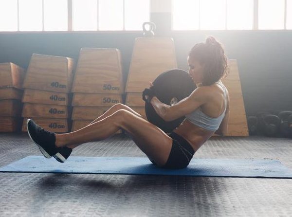 Lie on the floor holding a weight plate at your chest. Bend your knees 90 degrees with feet on the floor. Tuck your button to your chest and sit up all the way.