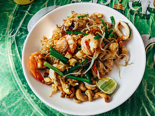 Pad Thai is a classic Thai dish that has gained popularity globally due to its flavourful and savoury taste. Consisting of stir-fry rice-noodles with bean sprouts, vegetables, tofu, chicken or shrimp, this dish is flavoured with a nutty sauce made with tamarind, peanuts, chilli flakes, fish sauce, and lime juice.