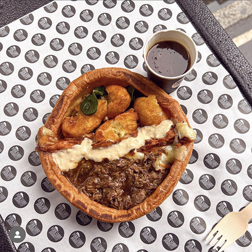 This is a viral and modern take on the traditional Roast, allowing one to have all the goodness of a Sunday Roast on-the-go. Yorkshire Burrito is a street food chain that is located in popular parts of London such as Shoreditch, Camden Market and Leather Lane Market. A fluffy Yorkshire Pudding is stuffed with all the contents of a Roast, including beef, chicken, or cauliflower, crispy potatoes, stuffing and gravy, all wrapped up into a burrito.